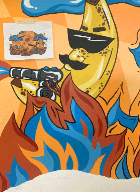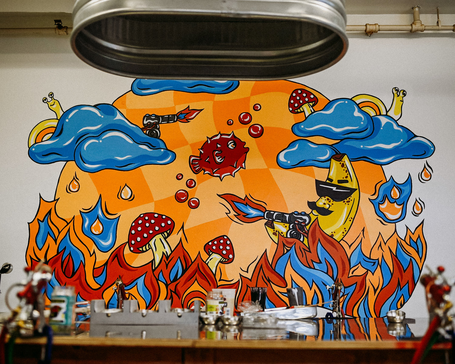 One of my proudest projects to date is a mural created for Chadly Glass Studio here in Portland, Oregon. Tasked with brightening their glass-blowing space, I designed a mural that mirrored the fluidity and vibrancy of glass through a trippy sunset backdrop, glass-like clouds, and the inclusion of flames and glassblowing tools within the artwork. A signature part of this design is the puffer fish in the center of the artwork - based on some of Brahim’s (the owner of Chadly Glass Studio) glass designs.